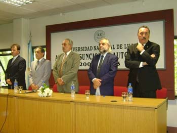 el traspaso de mando legal ante escribana pública. El intendente interino de Luján, Hernán Mosca, el nuevo Rector Carlos Cansanello, el Rector saliente Osvaldo Arizio, el Jefe del Gabinete de Asesores de la SPU / Minist. Educación, Daniel López, y el Vicerrector Bacarini, al comenzar el Acto. |